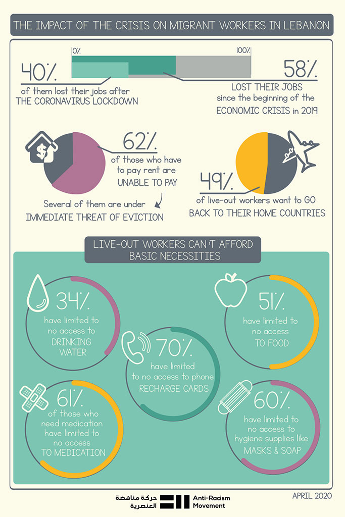 The Anti-Racism Movement warned of the seriousness of the living conditions associated with the spread of the pandemic. This puts refugees, workers, and independent migrant domestic workers at higher risk of contagion for many reasons, most notably the reluctance of refugees and migrants to go to the hospital to get tested or treated for fear of getting arrested for holding expired residence permits.