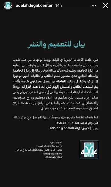 On October 8th, the Adalah legal center, headquartered in Haifa, issued a statement condemning the University of Haifa for expelling several students due to their social media posts concerning ongoing events.