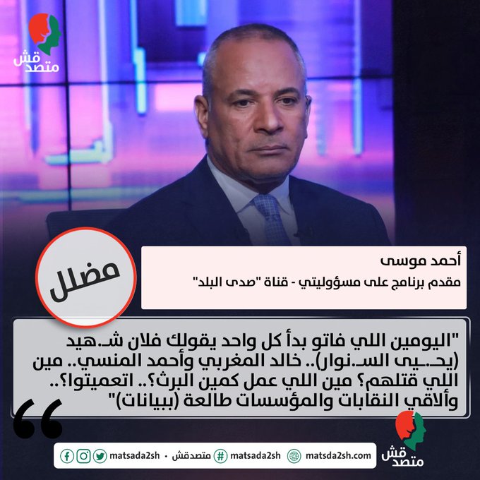 وراج تصريح منسوب للإعلامي المصري أحمد موسى، هو: "اليومين اللي فاتوا بدأ كل واحد يقولك فلان شهيد (يقصد يحيى السنوار)... خالد المغربي وأحمد المنسي... مين اللي قتلهم؟ مين اللي عمل كمين البرث؟… اتعميتوا؟... وألاقي النقابات والمؤسسات طالعة (ببيانات)". تقصّت منصة "متصدقش" على تصريحات موسى، وتوصلت إلى أن موسى لم يحدد اسم من يقصده بشكل مباشر، لكن تصريحاته جاءت بعد يوم من اغتيال السنوار. وأوضحت المنصة أن حديث "موسى" مضلل؛ إذ لا توجد علاقة بين وصف "السنوار" بـ"الشـهيد"، واسـتـشهاد ضباط وجنود من الجيش المصري، بينهم النقيب خالد المغربي، والعقيد أحمد المنسي، في الهجوم الإرهابي على كمين البرث عام 2017، إذ لم تتهم أي من أجهزة الدولة المصرية حماس بقتلهما أو بالتورط في واقعة كيمن البرث.