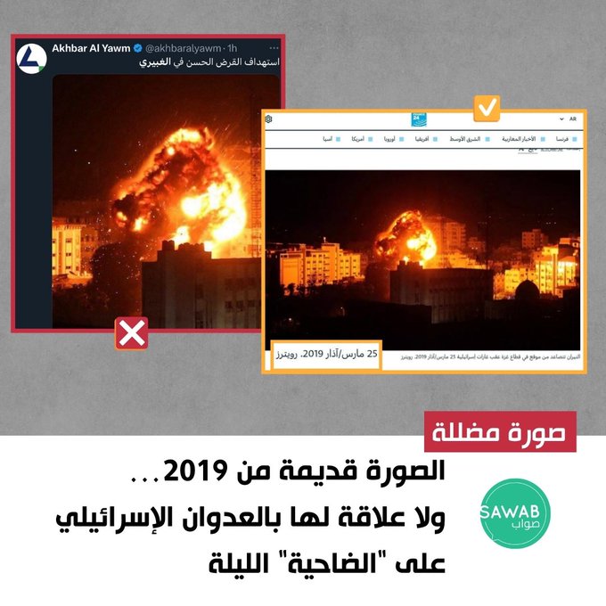 تحقق فريق صواب أيضاً من صورة يزعم ناشروها أنها تصور جانباً من العدوان الإسرائيلي على منطقة الغبيري في الضاحية الجنوبية لبيروت، واتضح أن الصورة قديمة وترجع إلى عام 2019، والتقطت عقب هجوم إسرائيلي على قطاع غزة.