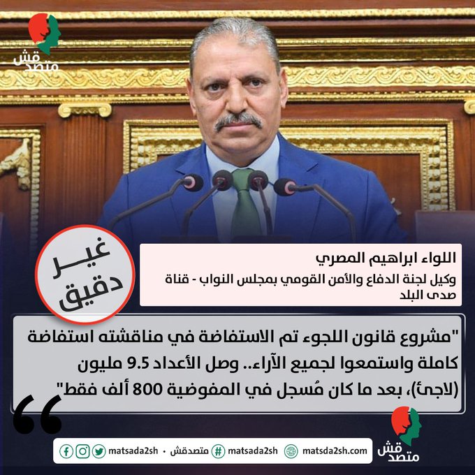 صرّح وكيل لجنة الدفاع والأمن القومي بمجلس النواب المصري، اللواء إبراهيم المصري، بأن "مشروع قانون اللجوء تمت الاستفاضة في مناقشته استفاضة كاملة واستمعوا إلى جميع الآراء". كشفت عملية التحقّق التي أجرتها "متصدقش" أن قانون تنظيم لجوء الأجانب في مصر لم يُعرض للحوار المجتمعي أو على العاملين في مجال الهجرة وحقوق اللاجئين قبل تقديمه إلى مجلس النواب.