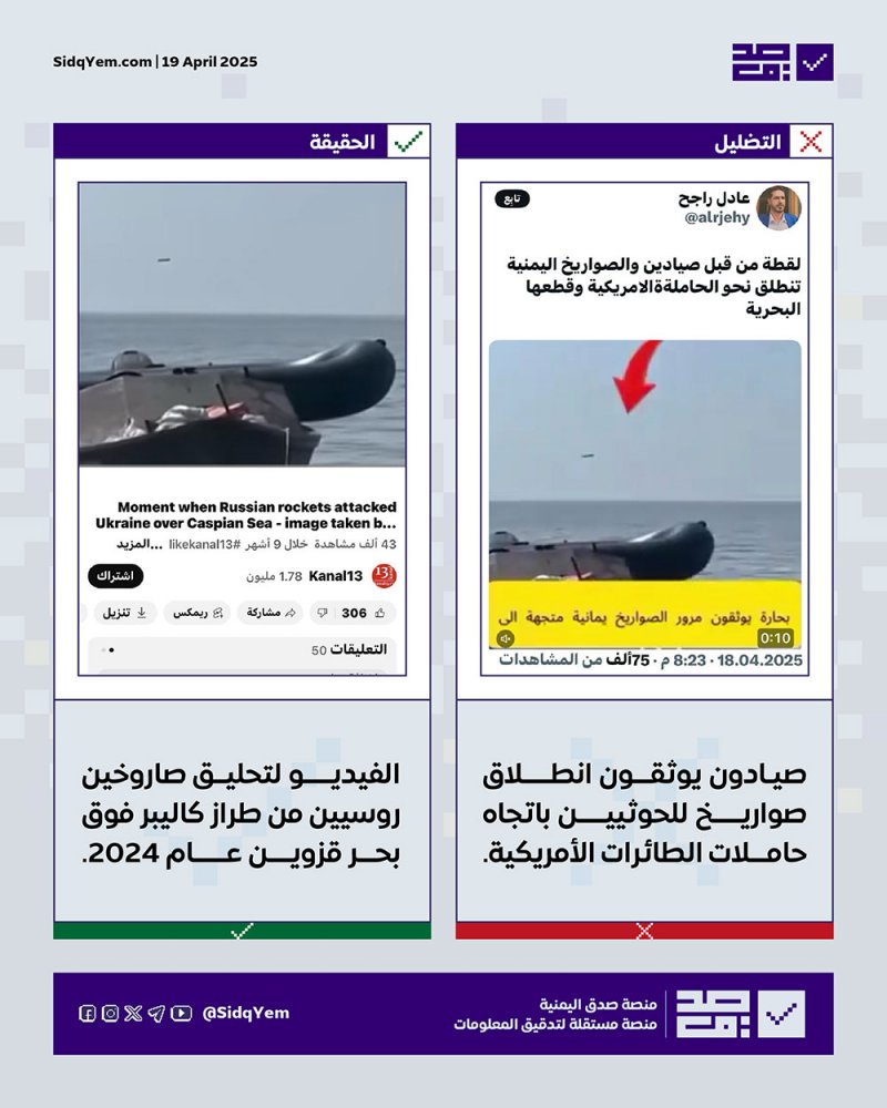 دقّقت منصّة "صدق" اليمنية المتخصّصة في تدقيق المعلومات في الفيديو، وتوصّلت عبر البحث العكسي عن مصدره، إلى أنه نشر لأول مرة في 10 تموز/ يوليو 2024، ويظهر تحليق صاروخين روسيين من طراز "كاليبر" فوق بحر قزوين، باتجاه أهداف أوكرانية.