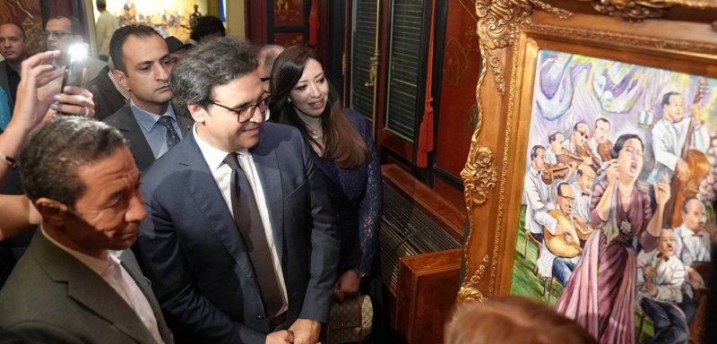 وزير الثقافة ومديرة مجمع الفنون أمام لوحة الفنانة كاريل حمصي