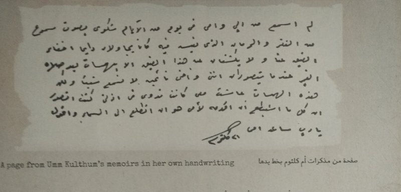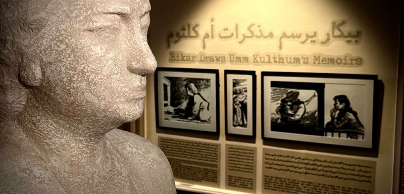 بقيت لفيلا أم كلثوم صور فوتوغرافية، لا تعيد الأصل، في معرض "صوت مصر" الذي يضم أكثر من 30 عملًا تشكيلياً في النحت والتصوير تستلهم روح أم كلثوم. لحسين بيكار وحده أكثر من عشرة رسوم مصاحبة لمذكرات أم كلثوم. تعاونا معاً في كتاب المذكرات. لا نعرف هل اكتملت، أم توقفت عند مرحلة معينة، فتوقفت معها رسوم بيكار؟