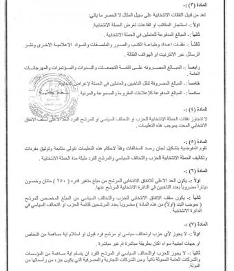 المبلغ المشار إليه يشمل على سبيل المثال لا الحصر، النفقات الانتخابية المرتبطة باستئجار المكاتب والقاعات لغرض الحملة الانتخابية، والمبالغ المدفوعة للعاملين في الحملة الانتخابية، ونفقات إعداد وطباعة الكتب والصور والملصقات والمواد الإعلامية الأخرى ونشر الرسائل عبر الإنترنت أو الهواتف النقالة، والمبالغ المصروفة على إقامة التجمعات والندوات والمؤتمرات والمهرجانات العامة، والمبالغ المصروفة لنقل الناخبين والعاملين في الحملة لأغراض انتخابية، والمبالغ المدفوعة للإعلانات المقروءة والمسموعة والمرئية، وفقاً للقوانين الانتخابية.