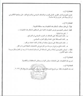 وتُلزم مفوضية الانتخابات، المرشحين والأحزاب بتقديم تقارير مالية نهائية للحملة الانتخابية خلال مدة 30 يوماً من تاريخ إعلان النتائج الأولية.