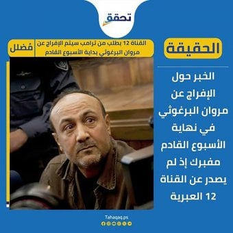 تداولت صفحات عبر مواقع التواصل الاجتماعي العربية بكثرة خبراً منسوباً إلى القناة 12 الإسرائيلية، يزعم أن الرئيس الأمريكي، ترامب، طلب من إسرائيل الإفراج عن القيادي الفلسطيني الأسير مروان البرغوثي بداية الأسبوع المقبل.