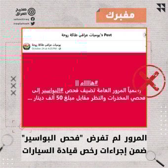 في العراق أيضاً، راج ادعاء مفاده أن "مديرية المرور العامة أضافت فحص البواسير إلى فحصَي المخدرات والنظر مقابل 50 ألف دينار عراقي"، ما أثار موجةً من التعليقات الساخرة على مواقع التواصل الاجتماعي. تحقّقت منصّة "صحيح العراق" من الادعاء وبيّنت أنه مزيف تماماً، إذ لم تُصدر مديرية المرور أي تعليمات في هذا الصدد ولم تنشر الخبر المزعوم أي وسيلة إعلام موثوقة.