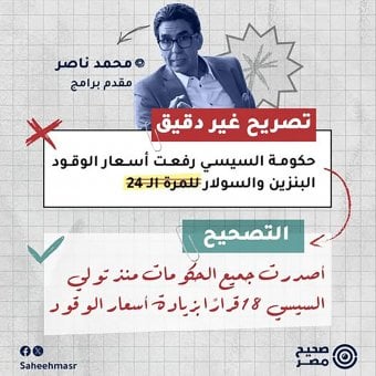 تداولت حسابات على مواقع التواصل ادعاءً منسوباً لمقدم البرامج المصري المعارض، محمد ناصر ، مفاده أن "الحكومة في عهد (الرئيس عبد الفتاح) السيسي رفعت أسعار الوقود 24 مرةً".