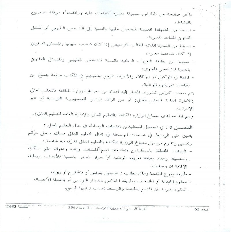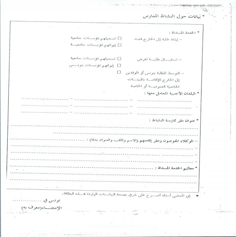 عند العودة إلى السجل الوطني للمؤسسات، ظهر لنا المكتب الخامس الذي وصلتنا شهادات عنه تتضمّن ممارسات تنتهك حقوق الطلاب، معتمداً منذ آذار/ مارس 2020، بصفة سجلّ مهني، ونشاطه المصرّح به هو "الاستشارات في الأعمال والتصرف". لا وجود لأي ذكر للوساطة التعليمية أو خدمات التسجيل الجامعي، ولا أثر لترخيص من وزارة التعليم العالي يجيز له العمل في هذا المجال. على الورق، يبدو المكتب مجرد وحدة صغيرة في قطاع الاستشارات. لكن في الواقع، يعرض خدمات شاملةً للطلبة: فتح ملفات، تسجيل جامعي، ترجمة، وعود بالمنح والسكن والتأشيرات.