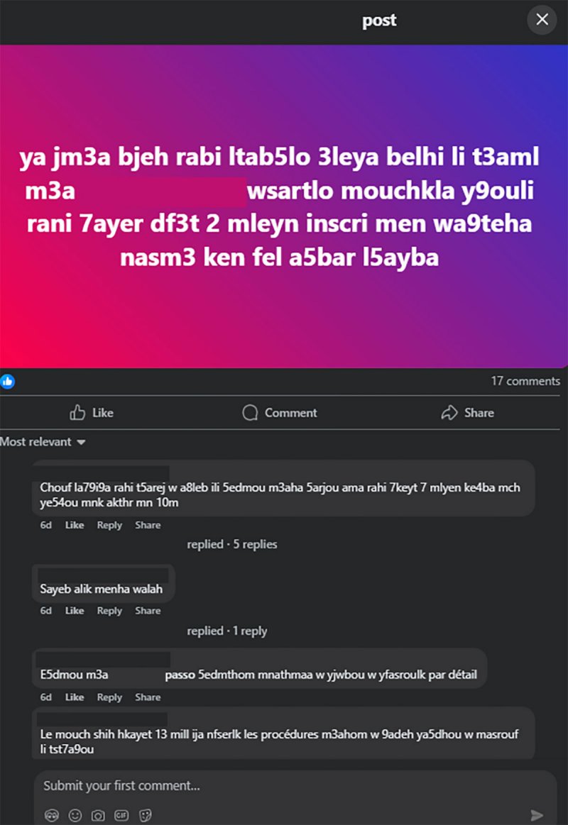 "الطالب يدفع ما بين 2،000 و5،000 دينار، ثم يكتشف عند وصوله أنّ السكن غير موجود، والمنحة وهمية، وأنه غير مسجّل أصلاً"، يوضح الكرباعي، مضيفاً أن هذه المكاتب تروّج لـ"نجاحاتها" عبر مقاطع مصورة على "تيك توك" وفيسبوك وغيرهما من مواقع التواصل الاجتماعي، حيث تُظهر بعض الطلبة الذين حصلوا على تأشيرة بالفعل، لتوهم الآخرين بأنّ النجاح مضمون للجميع. جدير بالذكر أننا، في هذا التحقيق، وثّقنا ممارسات مشابهةً تقوم بها مكاتب معتمدة، في ظل غياب الرقابة الرسمية والمساءلة.