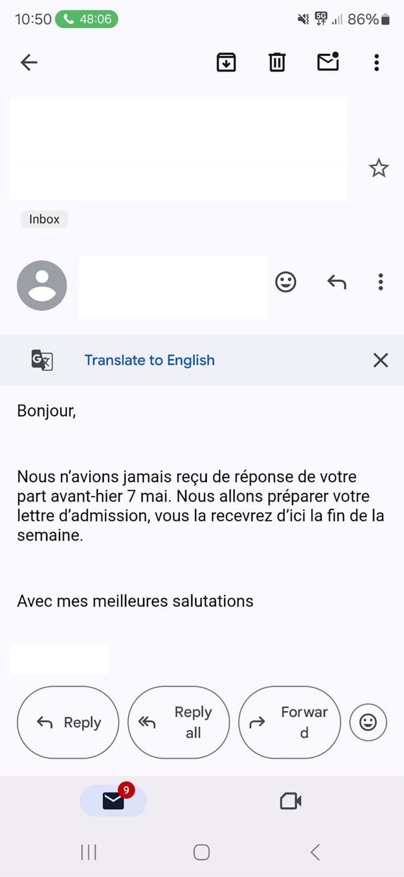 حين اطلعت رقية على المراسلات، اكتشفت أن المكتب لم يرسل للجامعة كل الوثائق المطلوبة، وأن المراسلات بين الطرفين كانت غير احترافية حيث لم يرفق المكتب الوثائق كافة المطلوبة للجامعة، ما استنتجت منه أن رفضها كان بسبب تقصير المكتب.