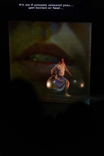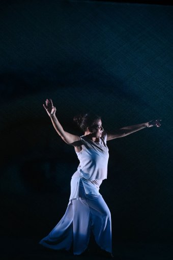 إلى جانب الفيديو التوثيقي، يحتل المسرحَ جسدٌ أنثوي يستهلُّ حركته ببطء، ومع تطور العرض ينثني جسد الراقصة بحركات تعبيرية تُذيّلها ببعض الرقص الشرقي، مزيجٌ تواءمَ مع مضمون العرض، كانت صممته الراقصةُ برفقة المخرجة متكئةً على مفردات الرقص الأوليّة، الحوض والبطن واليدين، وتشحنها بعواطفها لتلتقي بثالوث الخلق والأمومة، القلب والحوض واليدين.