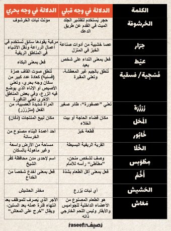 ختاماً، بعد هذه الرحلة بين المحافظات، هذه مجموعة متنوعة من الألفاظ التي حدث لها تغيّر دلالي بين وجه قبلي ووجه بحري في إطار مقارنة خلال الجدول التالي، تعلّمها جيّداً حتى لا تقع في لبس دلالي إذا تنقّلت بين الوجهين: