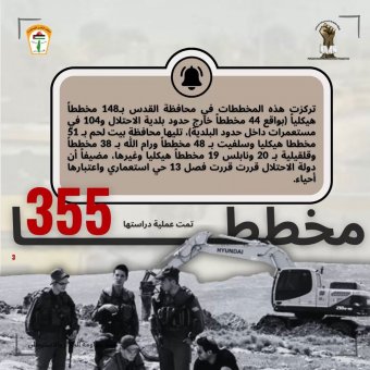 في حين يفيد تقرير شهر تشرين الأول/ أكتوبر الفائت، والصادر عن هيئة مقاومة الجدار والاستيطان، إلى أنّ الجهات التخطيطية الإسرائيلية درست خلاله 19 مخططاً هيكلياً في الضفة الغربية وداخل حدود بلدية الاحتلال في القدس، كما صادقت على 8 مخططات في الضفة الغربية بما فيها مشاريع ضمن نطاق E1، وأودعت 4 مخططات أخرى مصادقةً بذلك على إقامة 3،524 وحدةً استيطانيةً جديدةً ضمن مساحة تُقدَّر بـ2،233.138 دونماً، وبالإضافة إلى ذلك، فقد صادقت بلدية الاحتلال في القدس على مخططين وأودعت خمسة أخرى، ما يتيح بناء 1،205 وحدات إضافية.