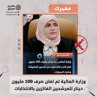 في السياق عينه، تداولت حسابات في وسائل التواصل الاجتماعي خبراً حول مباشرة وزارة المالية العراقية صرف 100 مليون دينار عراقي لكل نائب فائز كجزء من "تحسين المعيشة وشراء السيارات".