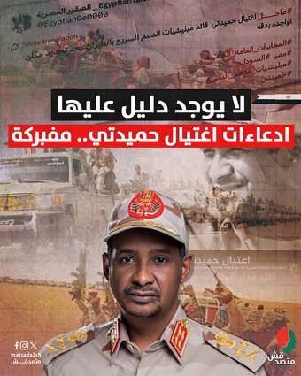في السودان، حقّقت منشورات ومقاطع فيديو تدعي اغتيال حميدتي تداولاً واسعاً في مواقع التواصل الاجتماعي. غير أن منصة "متصدقش" كشفت أن هذا الادعاء مفبرك، حيث لم تنشر أي جهة رسمية موثوق بها محلية أو دولية، خبر الاغتيال أو حتى إصابة حميدتي خلال المعارك الأخيرة.
