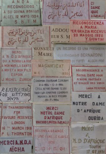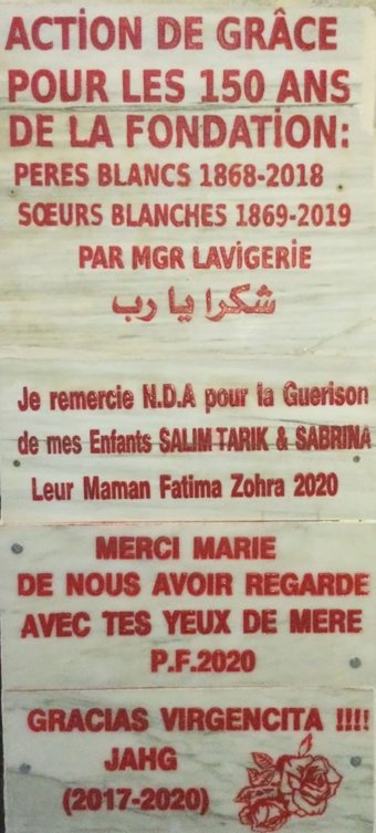 "يا سيدة أفريقيا صلي من أجلنا ومن أجل المسلمين" صلاة كتبت بالفرنسية والعربية والأمازيغية خلف المذبح بالكنيسة بمثابة رسالة جامعة تدعو إلى التسامح والاحترام المتبادل استجابة لغاية بناء هذا الصرح، وهي تعزيز الوحدة والسلام بين المسيحيين والمسلمين.