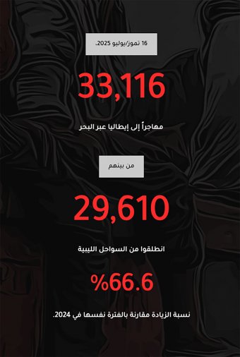 الصورة الأوسع لمشهد زيادة تدفقات الهجرة غير النظامية من شرق ليبيا، تُعطينا دليلاً إضافياً على استمرار شبكات التهريب في العمل بوتيرة أكبر من الأعوام السابقة. حتى 16 تموز/ يوليو 2025، وصل نحو 33 ألفاً و116 مهاجراً إلى إيطاليا عبر البحر، بزيادة قدرها 8.4% عن العام الماضي 2024؛ من بين هؤلاء 29 ألفاً و610 مهاجرين انطلقوا من السواحل الليبية، بزيادة بلغت 66.6%، مقارنة بالفترة نفسها عام 2024.