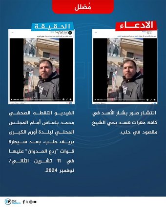 في السياق نفسه، انتشر مقطع فيديو مرفقاً بادعاء مفاده انتشار صور الرئيس السوري السابق بشار الأسد في كل مقار قوات قسد في حي الشيخ مقصود في حلب.