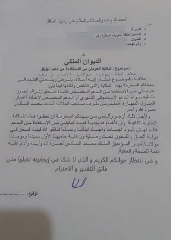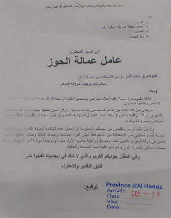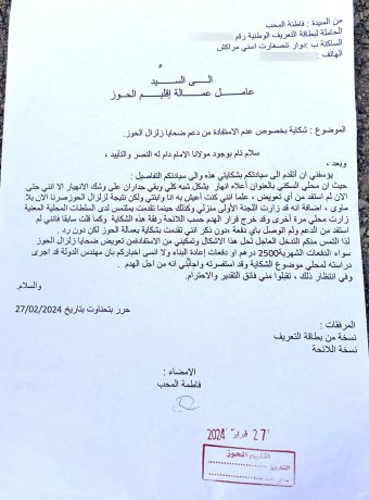 خلال هذه الفترة، بقيت رقية جلولات، التي فقدت منزلها في زلزال 2023، وهي من ذوات الإعاقة من دوار أنرني بالحوز، تعيش بلا مأوى قار ولا تعويضات. رغم سنّها المتقدّمة ووضعها الصحي الصعب، تواصل أسرتها طرق أبواب الجهات الحكومية دون جدوى إلى أن سُدَّت في طريقها جميع المنافذ لتراسل الديوان الملكي مباشرة لطلب إنصافها.