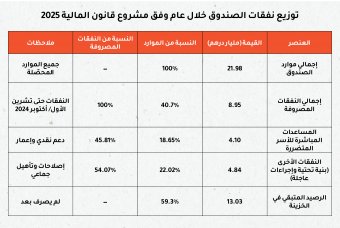 بحلول تشرين الأول/ أكتوبر 2024، لم يُصرف سوى 8 مليارات و948 ألف درهم (نحو 909 ملايين دولار) فقط، أي 40.7% من إجمالي الموارد البالغ 21 مليار درهم (نحو 2.3 ملياري دولار) حتى ذلك الحين. وظل نحو 13 مليار درهم (نحو 1.4 مليار دولار) -أي 60% من الموارد- غير مصروفة. عام بعد ذلك (أي حتى تشرين الأول/ أكتوبر 2025)، صرف نحو 15 ملياراً و537 مليون درهم (نحو 1.55 مليار دولار) من أصل 23 ملياراً و113 ألف درهم (نحو 2.3 ملياري دولار)، أي نحو 67.2% من الموارد فقط. ولا يزال نحو 7 مليارات و576 درهماً (نحو 834 مليون دولار)، أي ما يناهز ثلث أموال الصندوق تقريباً، "عالقة" في الحسابات البنكية للدولة دون أن تصل إلى الكثير من المتضررين فيما آلاف منهم ما زالوا يعيشون في أماكن مؤقتة، وبعضهم يواجه قرارات الترحيل والبعض الآخر يواجه شتاءً ثالثاً أكثر قسوة تحت الخيام.