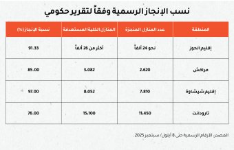 إلى 10 أيلول/ سبتمبر 2025، أُنجز 51 ألفاً و154 منزلاً من أصل 59 ألفاً و674، وفق آخر الأرقام المصرح بها في بيان رسمي صادر عن الحكومة المغربية، أي ما يناهز 87.37% من نسبة الإنجاز.