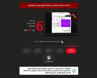 من خلال تتبع الحسابات، لاحظنا وجود عدد كبير من المنشورات المتماثلة أو المتشابهة، كانت تُنشر بأوقات شبه موحدة، ومن ضمن هذه المنشورات ما نشر حول إسقاط البرلمان التونسي مقترح ترحيل المهاجرين، ووضع قوانين لإدماجهم. وبالبحث في حقيقة الأمر، تبين أنه "خاطئ"؛ إذ لم يمرّر مكتب المجلس مقترح قانون لتنظيم ترحيل المهاجرين غير النظاميين، ونظّم يوماً دراسياً بخصوص هذا الملف، كما لم يضع قوانين تسرع إدماجهم.