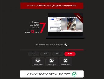 ومن خلال تتبع الفيديو، وجدنا أن ست صفحات من الشبكة التي توصلنا إليها، نشرته بعد وقت قصير من نشر حساب نزار بوديه Nizar Boudaya، وبالعنوان ذاته، الذي يشير إلى "كذبة الترحيل"؛ وذلك بعد قيام الأمن التونسي بإخلاء بعض مخيمات المهاجرين في صفاقس.