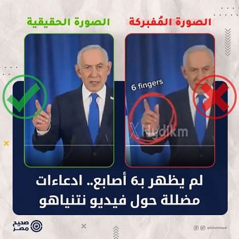 على خلفية شائعة مقتل رئيس الحكومة الإسرائيلية، نتنياهو، في الضربات الإيرانية الأخيرة على تل أبيب، انتشر مقطع مفبرك يظهر فيه نتنياهو ويده فها ست أصابع، كأحد الأخطاء البصرية الشائعة للمقاطع المولّدة بالذكاء الاصطناعي. وقامت منصتا "صحيح مصر" المصرية و"تحقّق" الفلسطينية بتتبّعه وتحليله، وأثبتتا أن الادعاء المقطع معدّل رقمياً وحدث تلاعب به باستخدام برامج الذكاء الاصطناعي.