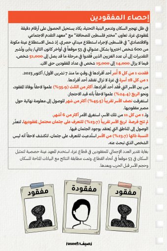 في ظل تهجير السكان وتدمير البنية التحتية، يكاد يستحيل الحصول على أرقام دقيقة لمفقودي غزة. تعاون "مختبر فلسطين للصحافة" مع "معهد التقدم الاجتماعي والاقتصادي" في فلسطين لإجراء استطلاع ميداني حصري توصّل إلى أن عدد الغزيين الذين فُقدوا في مرحلة ما قد يصل إلى 51,000 شخص، فيما لا يزال 14,000 إلى 15,000 شخص في عداد المفقودين حتى الآن