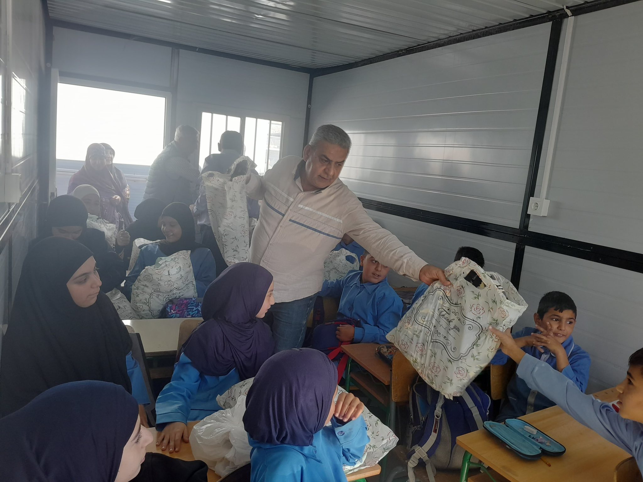 Passing out supplies to the children inside prefabricated classrooms. Photo courtesy of the Mais al-Jabal municipality.