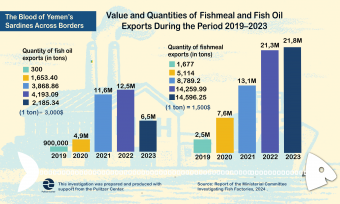 Official documents, statistics, and licenses reveal that these factories generate massive quantities of fishmeal and fish oil that are exported abroad with facilitation by the General Authority for Fisheries in Al-Mahrah.
