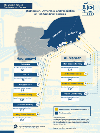 Hassani confirmed that he owns four grinding factories in Yemen: King Fisher Factory and Oceans Factory in Hadramawt, and Shibh Al Jazira Factory and Al-Nawras Factory in Al-Mahrah. These facilities were established between 2020 and 2023. He owns Oceans Factory outright, and holds shares ranging from 25 to 40 percent in the other factories, with Yemeni and Indian partners owning smaller stakes. According to Hassani, the factories produce about eight thousand tons annually of fishmeal and fish oil.